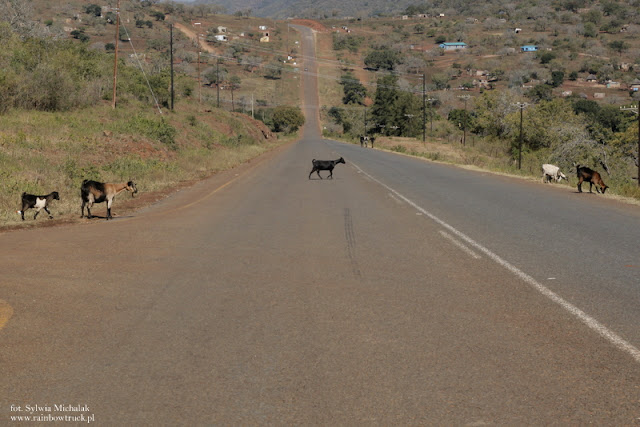 Królestwo Suazi ma w sobie królewskie piękno. Mała, bajkowa, górzysta kraina, na przejechanie której wystarczy zaledwie jeden dzień. Dowiedziałam się o jej istnieniu dopiero po dwóch latach podróży po afrykańskich bezdrożach. Żeby nie było aż tak łatwo, to ceny za noclegi skoczyły czterokrotnie w górę. Nie ma pośrednich rozwiązań. Przydrożne motele to koszt nawet 100 zł. Co zrobić? Nic… cieszyć się chwilą i podążać za marzeniami. Nie… nie będziemy aż tak dużo płacić, stwierdzamy jednomyślnie. Poszukajmy czegoś u lokalnych gospodarzy. Po długich i bezskutecznych próbach znalezienia tańszego pokoju, tuż przed zachodem słońca, ukazuje się nasza ostatnia szansa. To stary budynek, wyglądający jak zaniedbany, długo nieużywany hotel. Ktoś każe nam podjechać pod drzwi i porozmawiać ze starszą panią, ona tu rządzi. Nie, nic nie ma, nie wynajmuję pokoi, odpowiada pani. Próbujemy ruszyć, a tu klops, przebita opona w dwóch miejscach. Robi się ciemno, więc Michał stara się szybko naprawić usterkę. Potrzebna jest latarka. Mam wrażenie, że ciemność zapadła szybciej, niż zawsze. Postaram się coś znaleźć, mówi w końcu starsza pani. O nie!!! Pośpiech nie okazał się najlepszym pomocnikiem. Śrubokręt robi kolejną dziurę w dętce, tym razem w tej nowej. No to lepiej żeby starsza pani jednak coś znalazła, mówię. Czekamy jeszcze chwilę. Jest bardzo zimno. Jesteśmy w górach i w nocy temperatura spada nawet o 20 stopni w dół. Robię co mogę, oznajmia z uśmiechem pani. Gotowe, mówi po chwili. Jedna z jej przybranych córek przeniosła się do pokoju siostry. Oddała nam swój pokój. Duży, z wielkim łóżkiem i łazienką. Nie ma bieżącej wody, ale to akurat najmniejszy problem. Dostajemy nawet wiaderko z grzałką, by nie zamarznąć przy wieczornej toalecie. Przy tych temperaturach zimny kubeł wody nie byłby najzdrowszym pomysłem. Zostańcie ile chcecie, oznajmia pani. Zaprzyjaźniamy się z rodziną i dzieciakami. Poznajemy miasteczko i okolice.